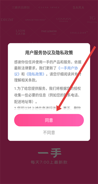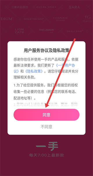 1、打開一手APP,在用戶服務(wù)協(xié)議及隱私政策彈窗中點擊同意,進(jìn)入登錄選擇界面。