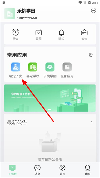 1、進入應用,在工作臺頁面的常用應用板塊,找到綁定子女選項并點擊。