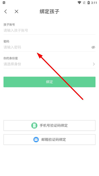 3、在信息填寫界面,依次輸入孩子賬號、密碼,選擇身份,點擊綁定按鈕,即可完成綁定操作。