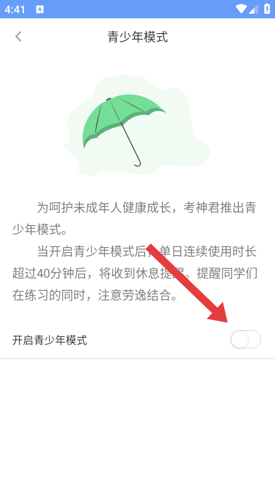4、在青少年模式頁(yè)面開啟開啟青少年模式的開關(guān),完成設(shè)置。