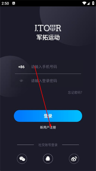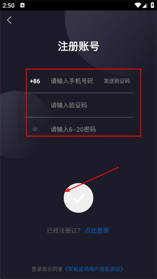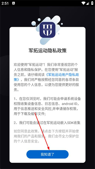 1、打開軍拓運動APP,在隱私政策頁面點擊我知道了。