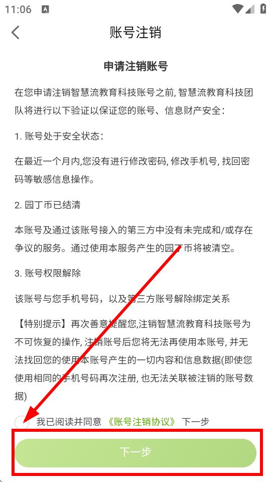 4、在賬號(hào)注銷頁面,仔細(xì)閱讀賬號(hào)注銷相關(guān)條件及提示,勾選然后點(diǎn)擊下一步,按照后續(xù)提示完成賬號(hào)注銷操作。