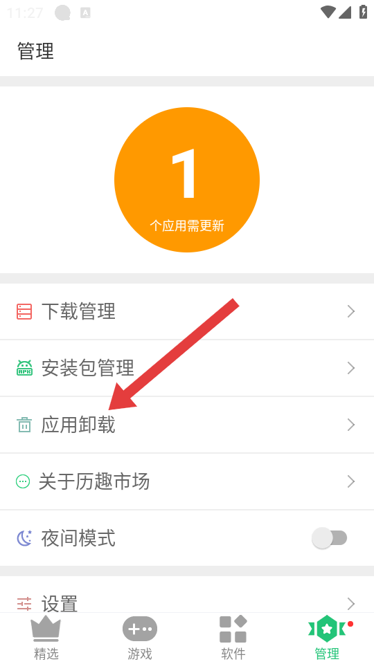 2、在管理頁面,點(diǎn)擊應(yīng)用卸載的選項(xiàng),進(jìn)入應(yīng)用卸載列表頁。