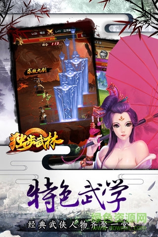 獨步武林九游游戲是一款武俠風格的rpg手游,游戲中玩家將回到古代快意恩仇的江湖中去,玩家不僅能通過運鏢、除暴、駐守等任務增加門派經(jīng)濟,增加聲望,也可以向其他門派挑戰(zhàn)!喜歡的朋友可以到綠色資源網(wǎng)下載體驗一下!