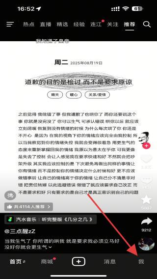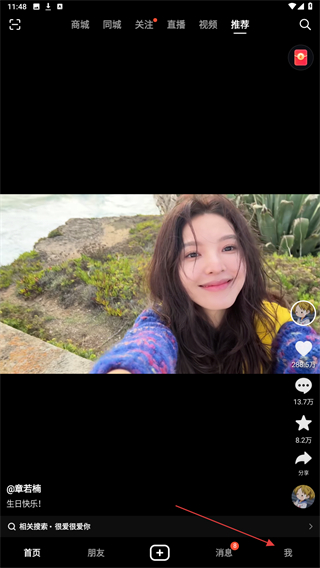1、啟動(dòng)抖音APP進(jìn)入到視頻播放頁(yè)面,再點(diǎn)擊底部導(dǎo)航欄最右側(cè)的我。