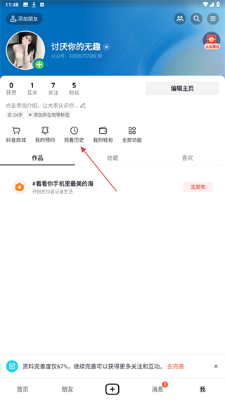 2、進(jìn)入我的頁(yè)面內(nèi),找到并點(diǎn)擊觀看歷史的按鈕。