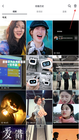 3、進(jìn)入觀看歷史的頁(yè)面內(nèi),點(diǎn)擊右上角刪除的圖標(biāo)。