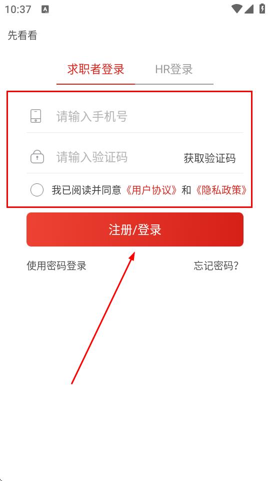 4、在求職者登錄頁面,輸入手機(jī)號,輸入驗(yàn)證碼,勾選我已閱讀并同意用戶協(xié)議和隱私政策,點(diǎn)擊注冊/登錄。