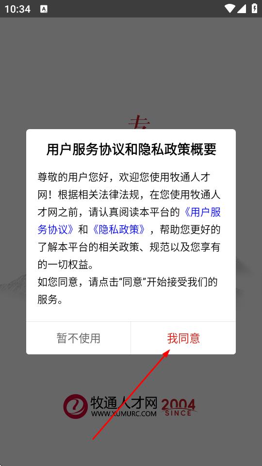 1、打開牧通人才網(wǎng)APP,在彈出的用戶服務(wù)協(xié)議和隱私政策概要窗口中,點(diǎn)擊我同意。