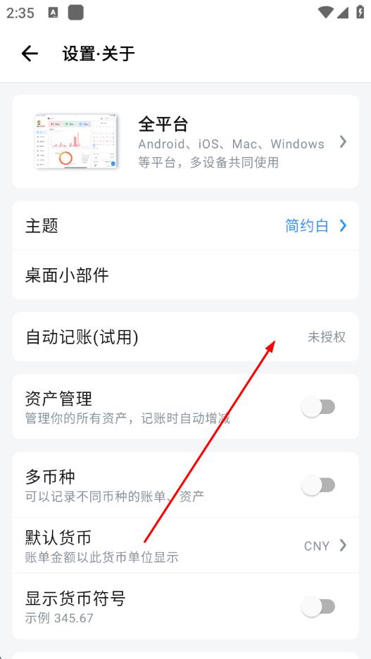 3、在設(shè)置頁(yè)面中,找到自動(dòng)記賬(試用)選項(xiàng)。