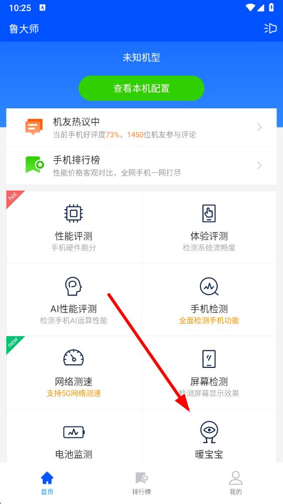 1、打開魯大師應(yīng)用,在首頁功能列表中,點擊暖寶寶選項,進入暖寶寶功能界面。