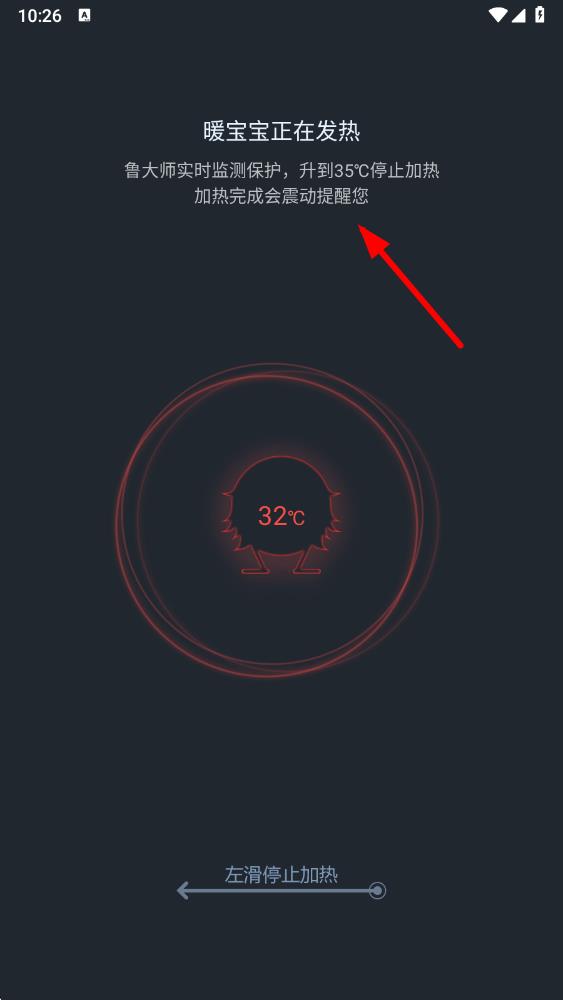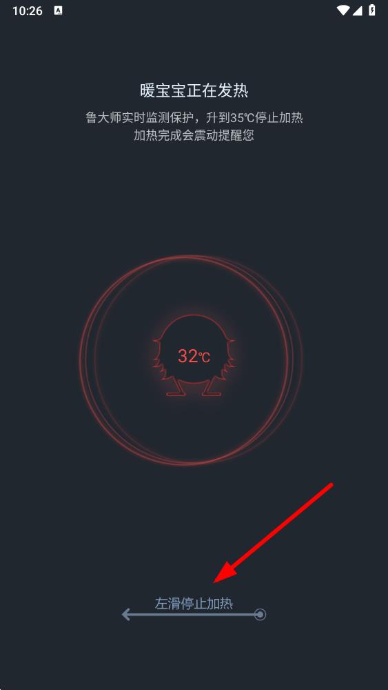 4、若想提前停止加熱,按照界面提示,向左滑動屏幕,即可關(guān)閉暖寶寶的發(fā)熱功能。