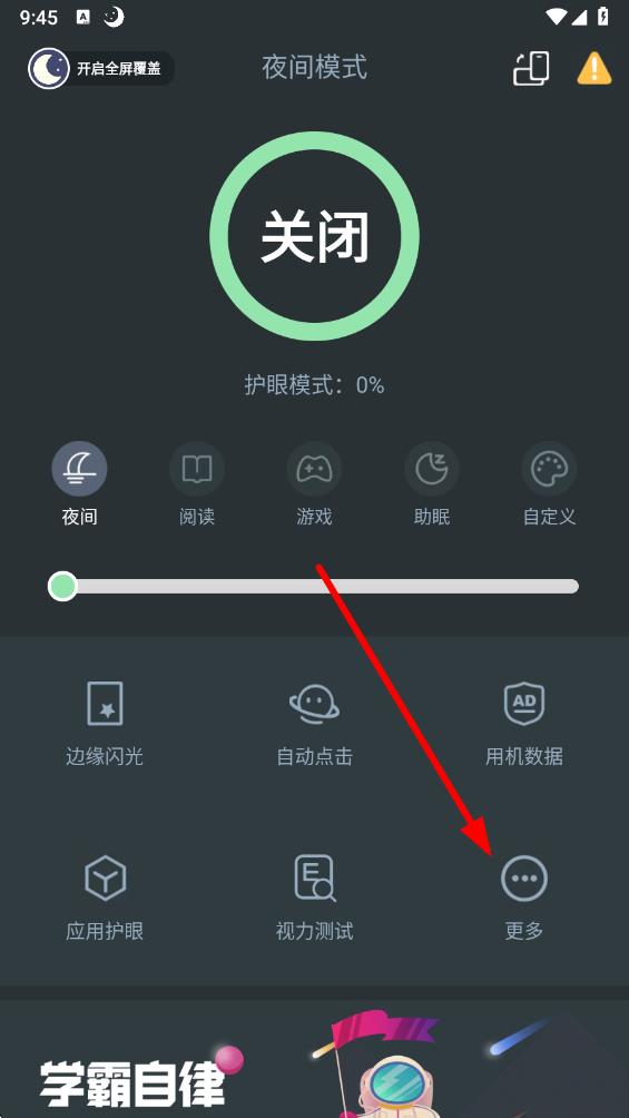 1、打開(kāi)夜間模式軟件,在主界面中點(diǎn)擊更多選項(xiàng),進(jìn)入更多設(shè)置頁(yè)面。