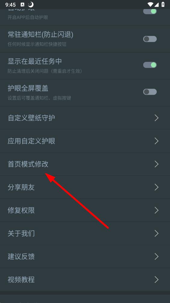 2、在更多設(shè)置頁(yè)面里,找到并點(diǎn)擊首頁(yè)模式修改選項(xiàng),進(jìn)入模式顏色設(shè)置界面。
