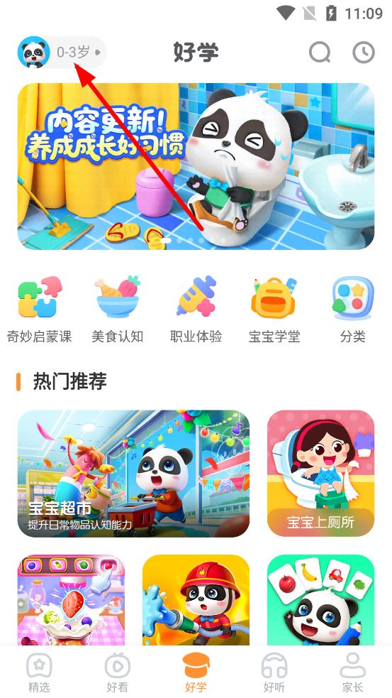 1、打開寶寶巴士應(yīng)用,點(diǎn)擊首頁左上角顯示年齡的區(qū)域。