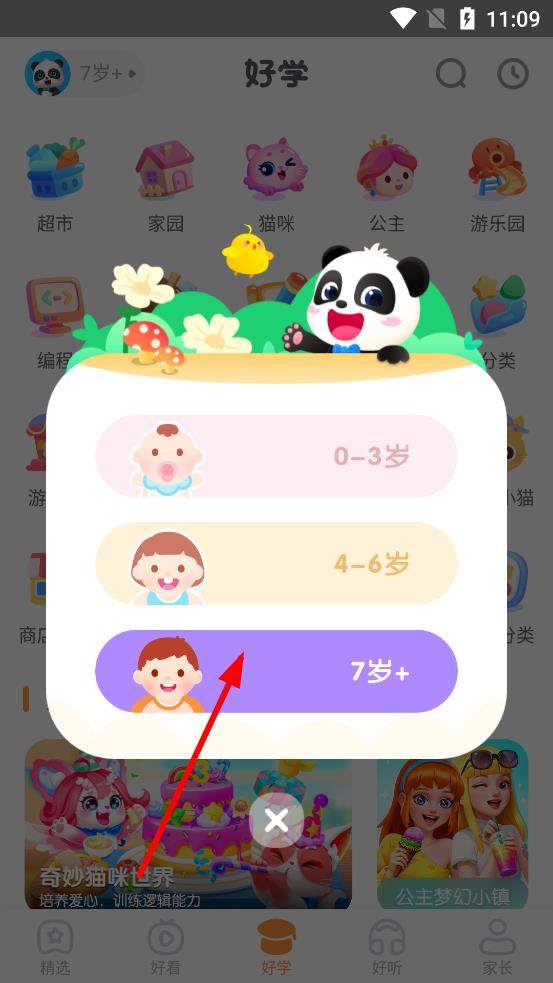 2、在彈出的年齡選擇彈窗中,點(diǎn)擊想要設(shè)置的年齡階段按鈕,如“0-3歲”“4-6歲”“7歲+”。