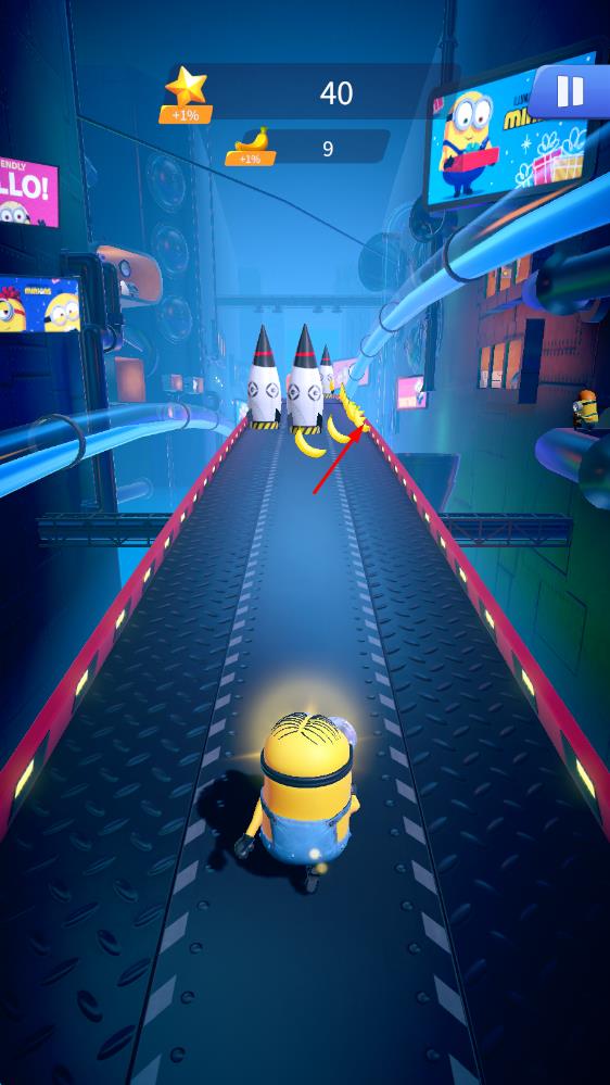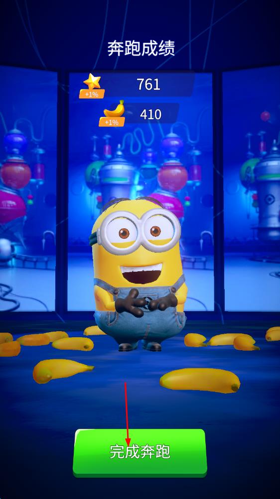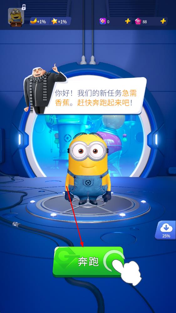 1、進(jìn)入游戲后,選擇心儀的小黃人角色,在格魯?shù)膶?shí)驗(yàn)室等初始場景中,通過滑動屏幕控制小黃人跑、跳、閃躲,開啟首場跑酷闖關(guān)。