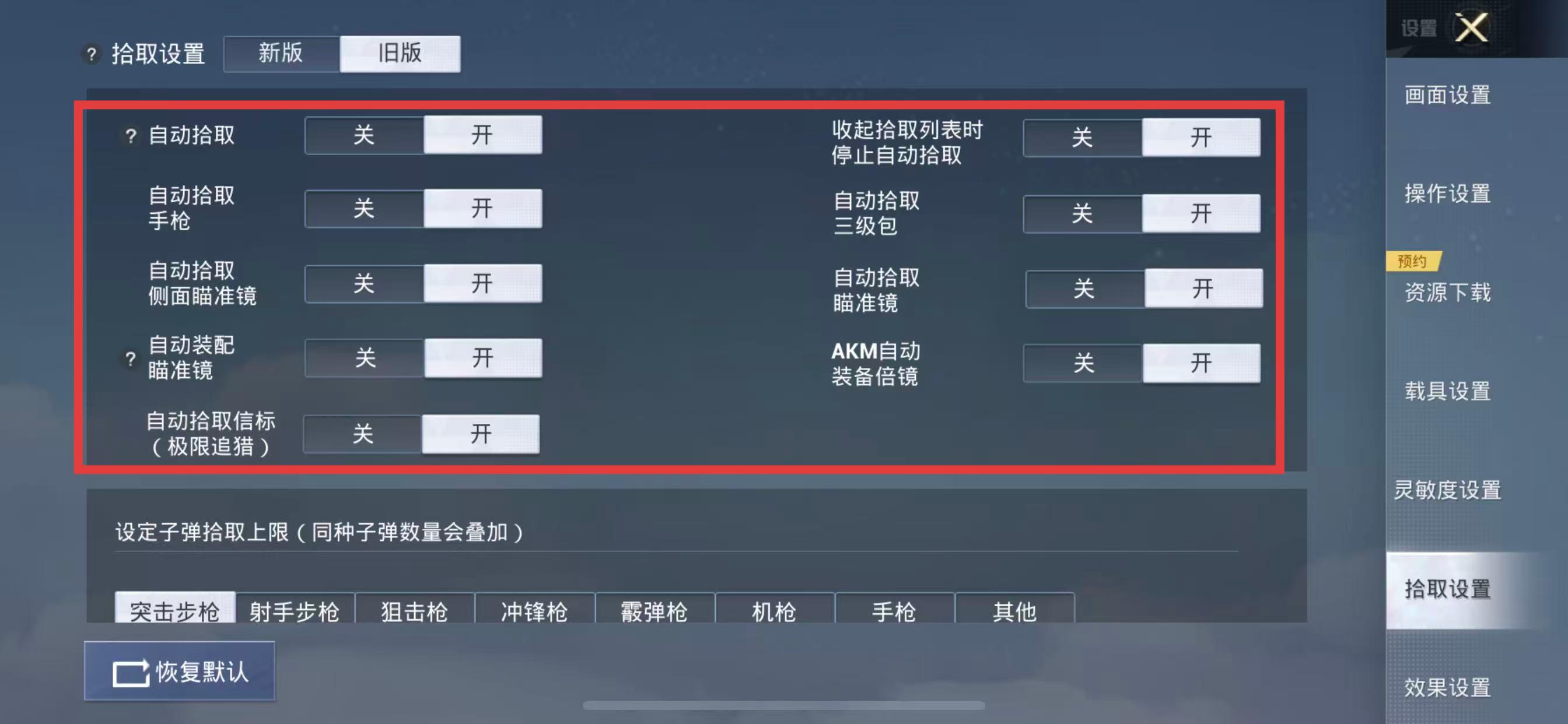 3、找到并點擊拾取設(shè)置選項,將需要自動拾取的物品對應(yīng)的開關(guān)開啟即可。