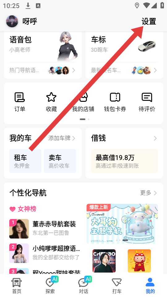 1、打開高德地圖APP,進入底部我的頁面,點擊右上角設置圖標,進入設置界面,開啟導航偏好配置的操作路徑。