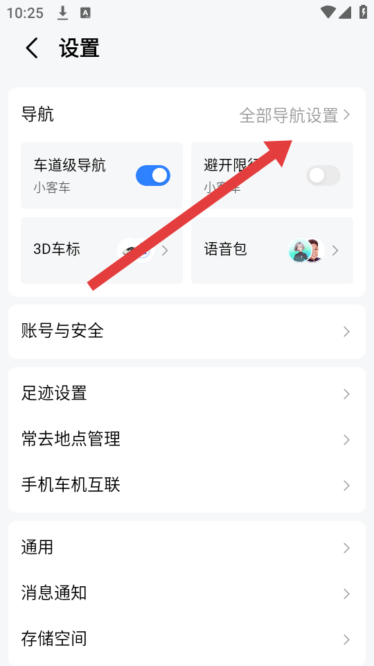 2、在設置界面中,找到全部導航設置選項并點擊進入,在貨車導航的路線策略板塊,勾選大路優(yōu)先選項,讓系統(tǒng)規(guī)劃路線時優(yōu)先選擇主干道。