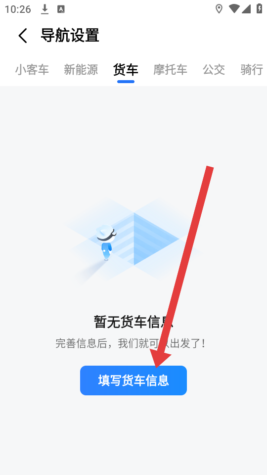 3、進入導航設置的貨車標簽頁,若顯示暫無貨車信息,點擊填寫貨車信息按鈕,錄入車輛類型、車長、限高等參數,為大路優(yōu)先導航提供基礎數據支撐。