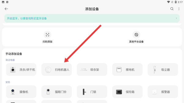 1、進(jìn)入到添加設(shè)備頁面后,找到手動添加設(shè)備區(qū)域下的掃地機器人進(jìn)行添加操作。