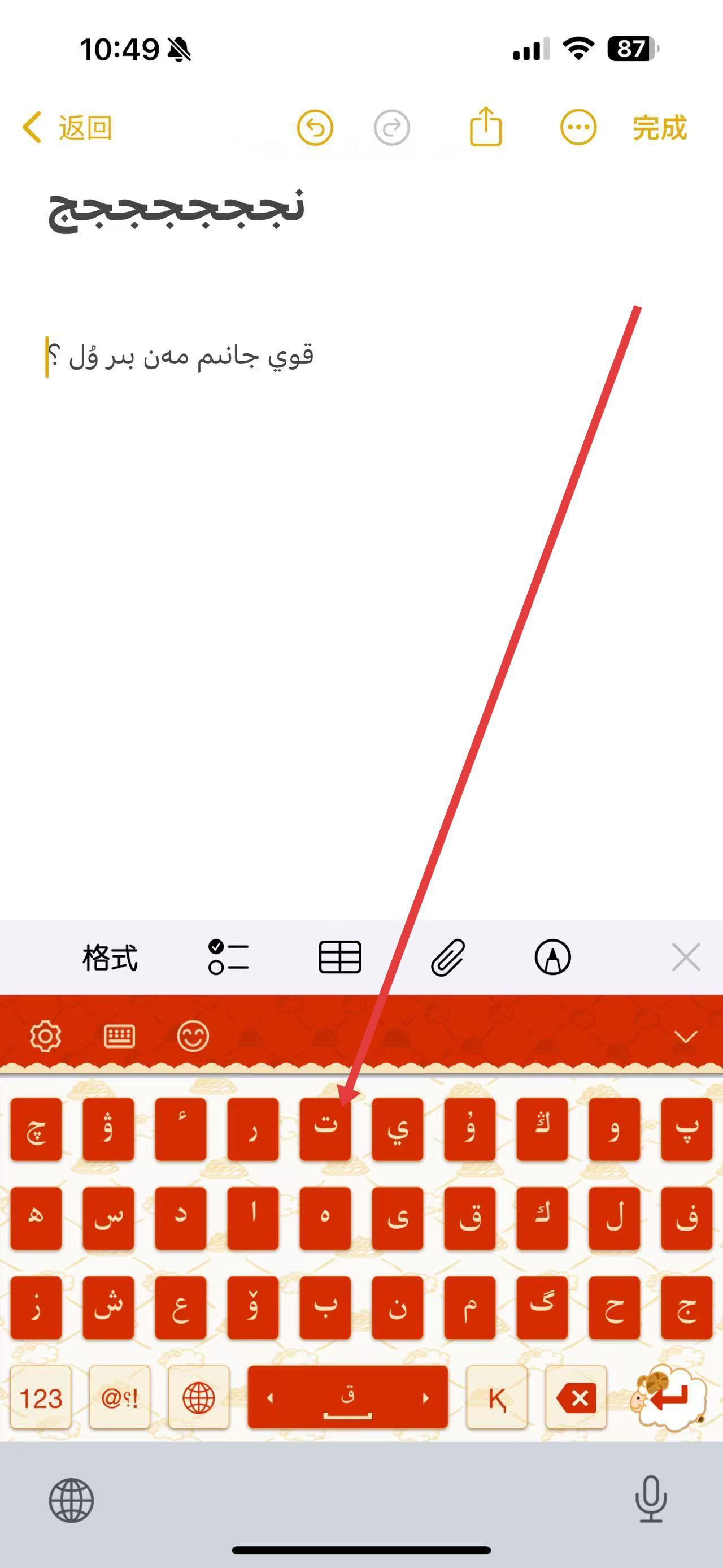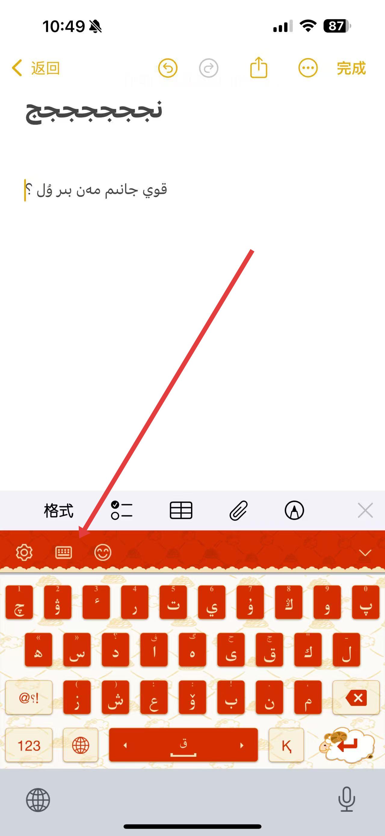 3、在紅色鍵盤界面,點擊箭頭指向的?按鍵,輸入對應字符,完成文字錄入操作。