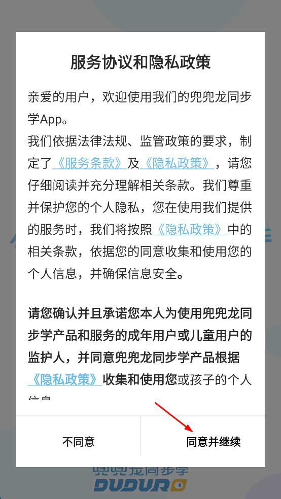 1、打開(kāi)兜兜龍同步學(xué)APP,會(huì)彈出服務(wù)協(xié)議和隱私政策提示框,點(diǎn)擊同意并繼續(xù),進(jìn)入登錄相關(guān)界面。