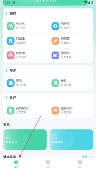 1、打開APP進(jìn)入首頁,使用預(yù)約功能,選擇約社區(qū)約醫(yī)院等服務(wù),點(diǎn)擊對(duì)應(yīng)入口預(yù)約,還能進(jìn)行導(dǎo)診診療操作,查看醫(yī)療公示健康視頻,進(jìn)入健康監(jiān)測(cè)板塊。