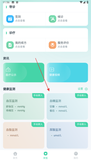 2、切換至家庭頁面,在健康監(jiān)測(cè)區(qū)域,手動(dòng)錄入血壓血糖血脂尿酸等數(shù)據(jù),管理健康指標(biāo),借助診療功能查看我的續(xù)方服務(wù)評(píng)價(jià),獲取醫(yī)療服務(wù)反饋。