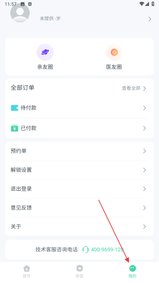 3、進(jìn)入我的頁面,查看親友圈醫(yī)友圈,管理全部訂單,進(jìn)行解鎖設(shè)置退出登錄等操作,反饋意見,了解關(guān)于信息,撥打技術(shù)客服電話解決問題。
