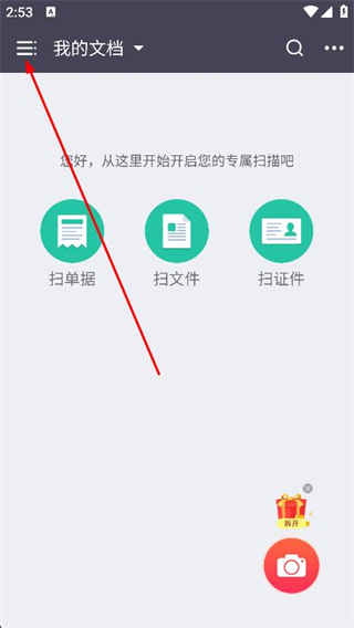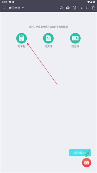 1、打開gk掃描儀APP,進入到首頁內(nèi)點擊掃單據(jù)的功能按鈕。