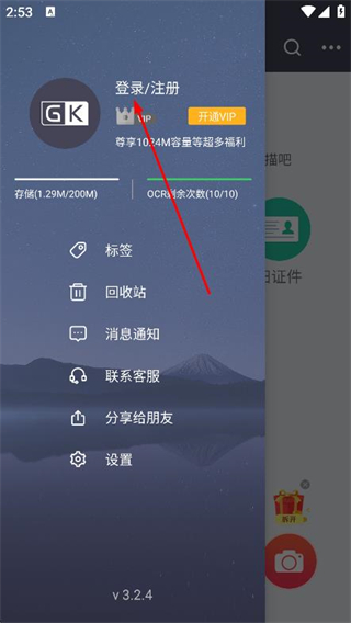 2、在彈出的側(cè)邊欄中,點擊上方登錄/注冊選項。