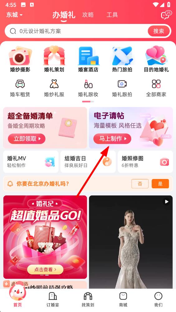 1、打開(kāi)婚禮紀(jì)App進(jìn)入首頁(yè)點(diǎn)擊電子請(qǐng)?zhí)鍓K中的馬上制作按鈕,進(jìn)入請(qǐng)?zhí)谱鬟x擇頁(yè)面。