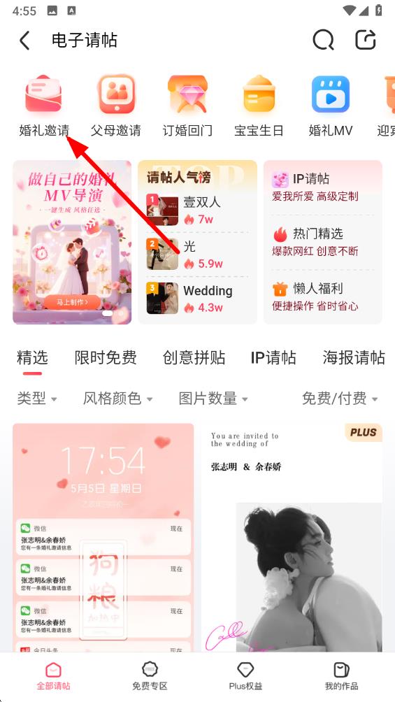2、在請(qǐng)?zhí)谱鬟x擇頁(yè)面中點(diǎn)擊婚禮邀請(qǐng)的選項(xiàng)卡,瀏覽各種婚禮邀請(qǐng)函模板。