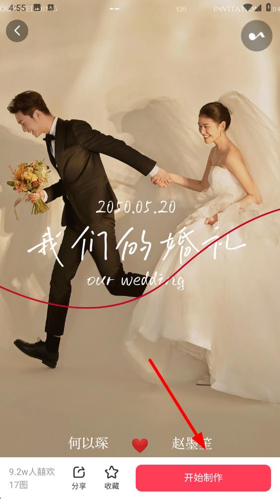 4、點(diǎn)擊選中模板下方的開(kāi)始制作按鈕,進(jìn)入編輯界面,按照提示上傳照片、修改文字等信息,完成后即可生成專屬婚禮邀請(qǐng)函。