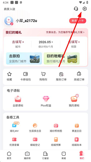 1、打開(kāi)婚禮紀(jì)app,在我們頁(yè)面點(diǎn)擊右上角設(shè)置圖標(biāo)。