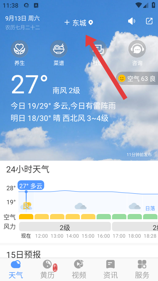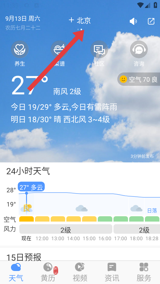 1、在黃歷天氣主界面,點(diǎn)擊頂部城市旁邊的+,進(jìn)入城市管理頁面。