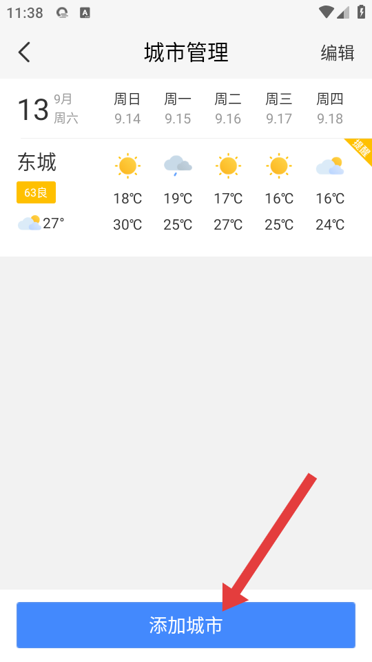 2、在城市管理頁面,點(diǎn)擊底部添加城市按鈕,進(jìn)入添加城市界面。