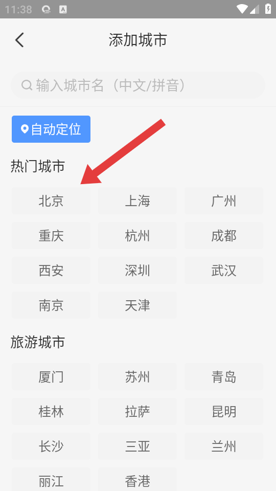 3、在添加城市界面,可通過搜索框輸入城市名,或直接點(diǎn)擊熱門城市中的目標(biāo)城市。