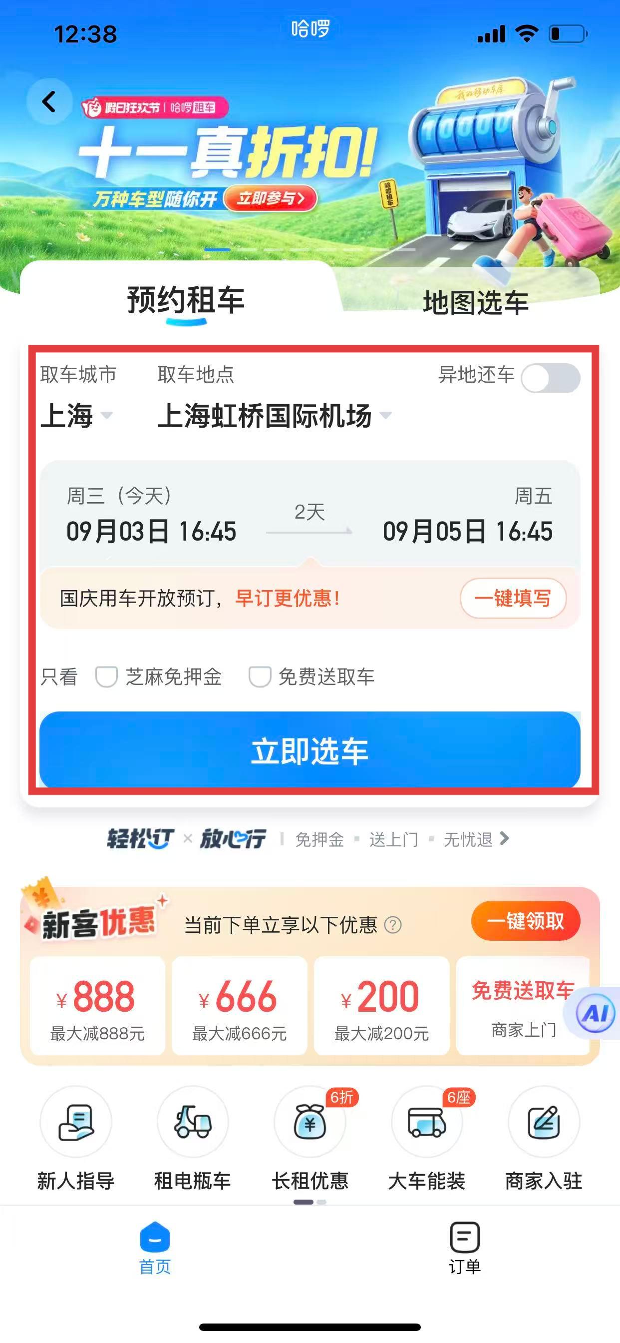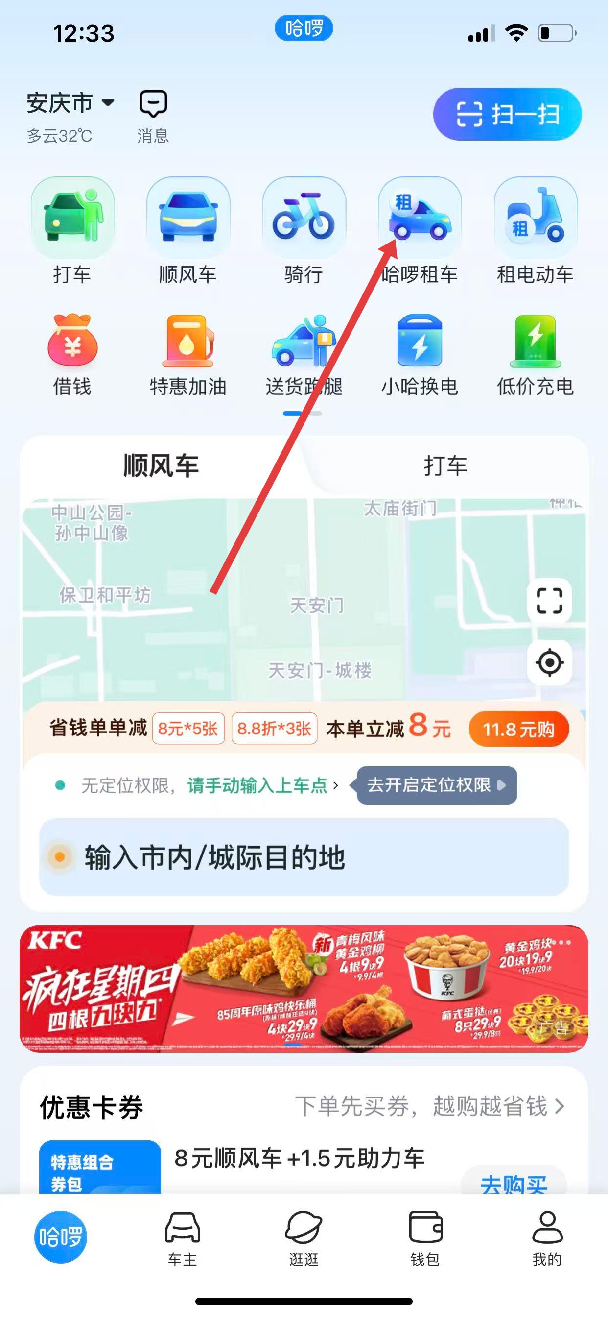 1、打開哈啰出行APP,進入主界面,點擊哈啰租車圖標,進入租車頁面。