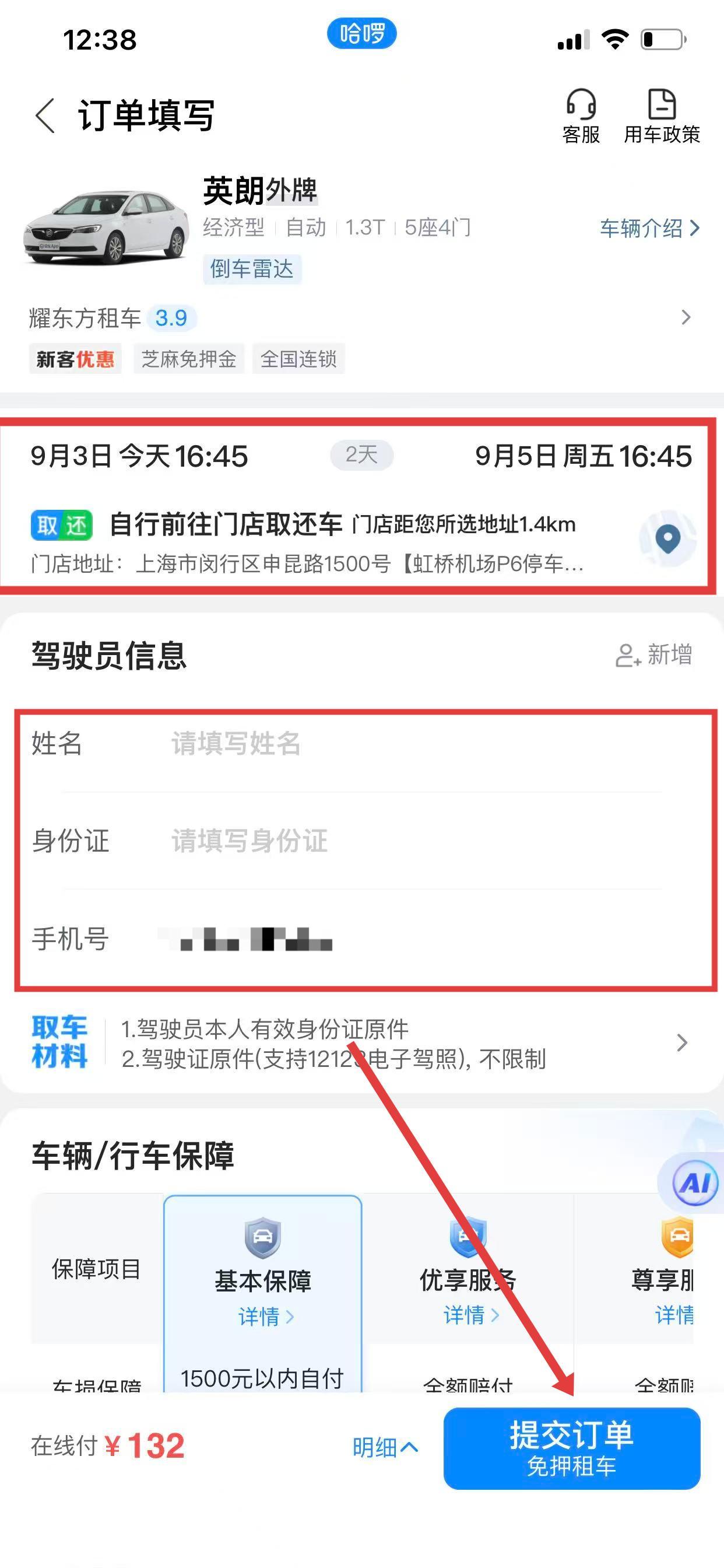 4、填寫駕駛員信息,點擊提交訂單,完成租車預訂。