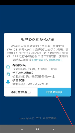 1、啟動安卓變聲器的應用軟件,進入時會跳出用戶協議和隱私政策,點擊同意并繼續(xù)的按鈕。