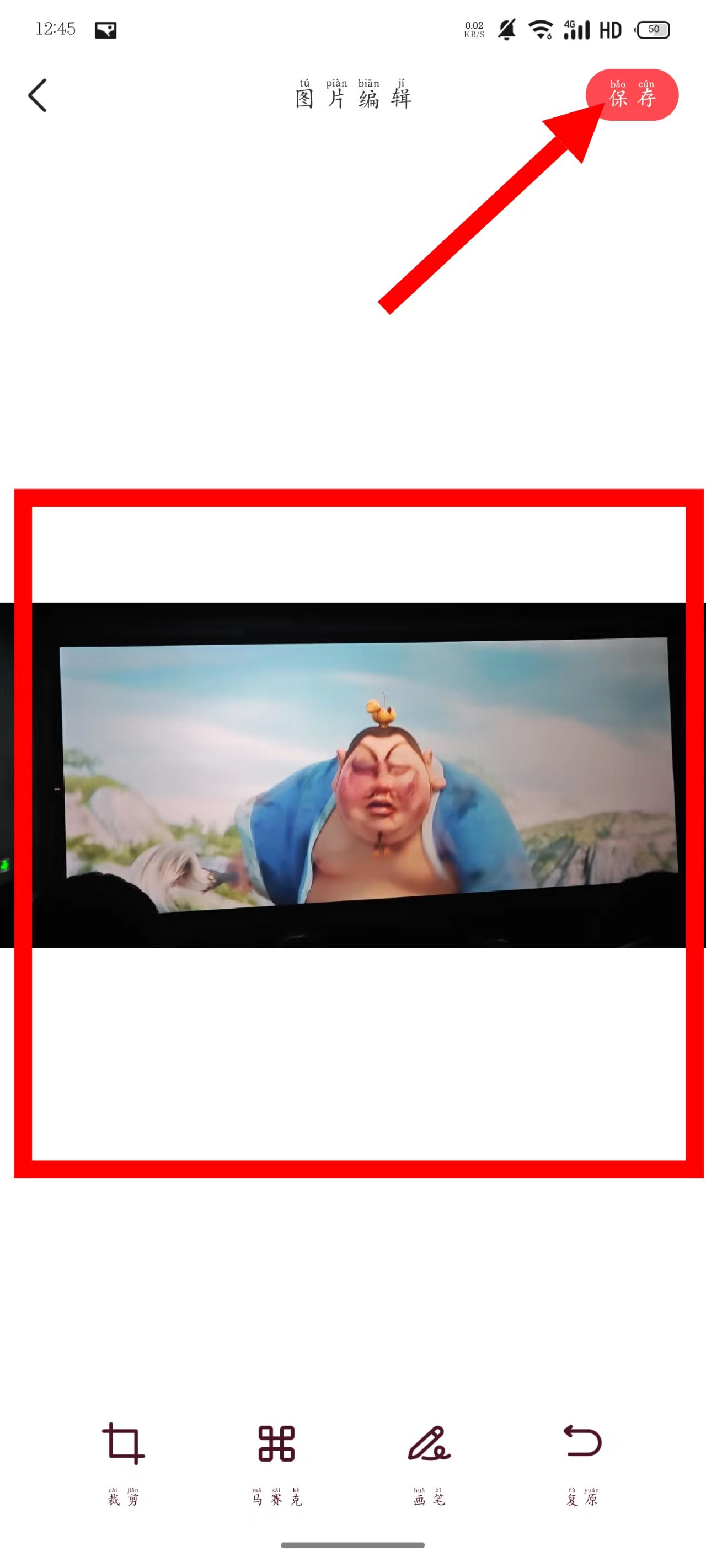 4、根據(jù)需求使用各類編輯工具調整圖片后,確認編輯效果滿意,點擊右上角的保存按鈕,將編輯好的圖片保存至手機。