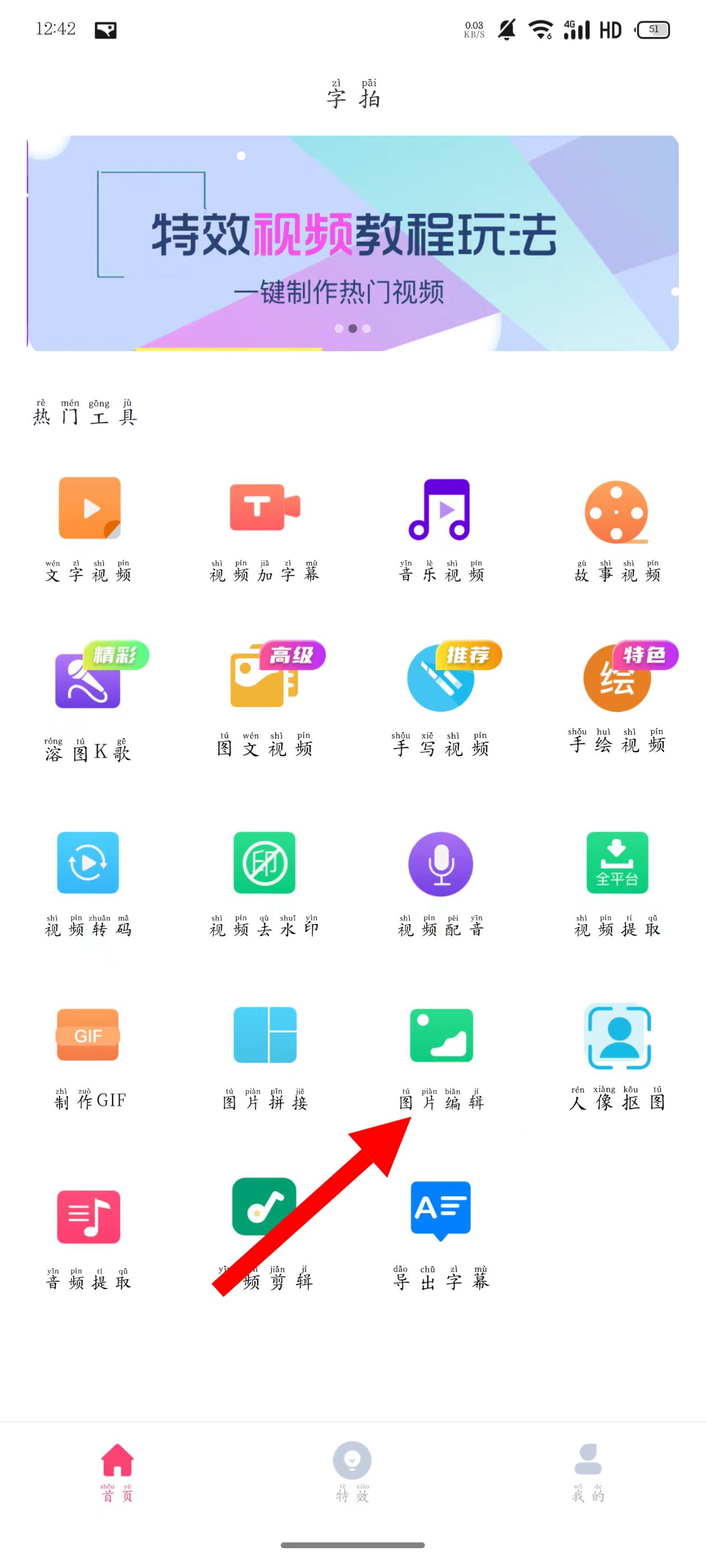 1、打開字拍app后,進入首頁界面在熱門工具區(qū)域找到圖片編輯圖標并點擊。