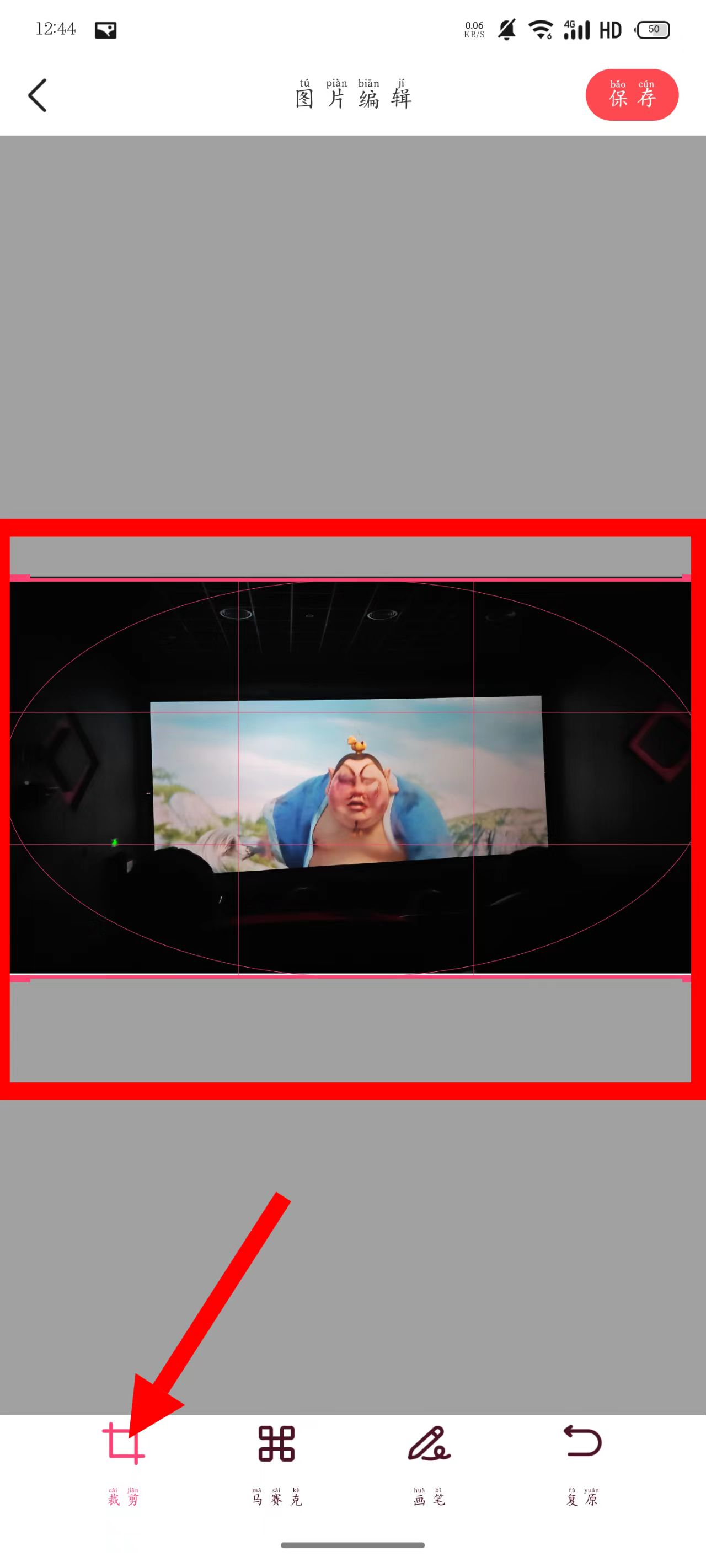 3、進入圖片編輯界面,可看到圖片顯示在操作區(qū)域,下方有裁剪、馬賽克、畫筆、復原等編輯工具選項,點擊裁剪工具對圖片進行裁剪操作。