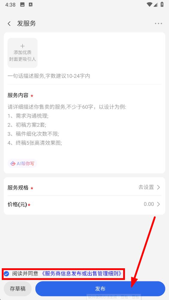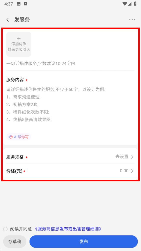 4、進(jìn)入發(fā)布服務(wù)界面,添加優(yōu)質(zhì)封面,填寫服務(wù)描述、詳細(xì)服務(wù)內(nèi)容,設(shè)置服務(wù)規(guī)格與價(jià)格。