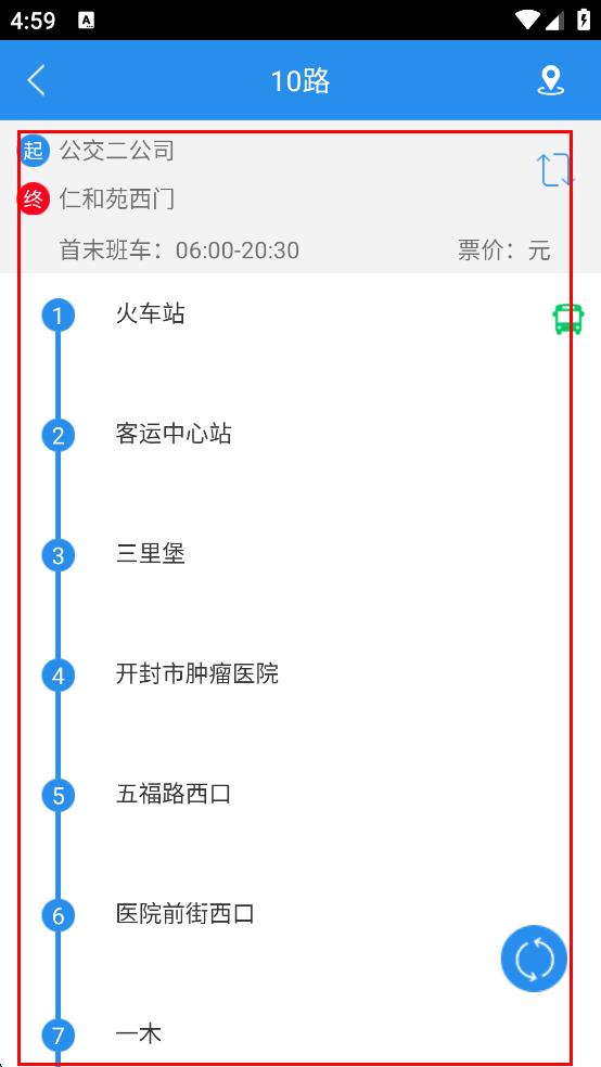 3、點擊“10路”后,進入該線路的詳情頁面,在該頁面即可查看“10路”公交的首末班車時間、票價以及站點等詳細(xì)信息。
