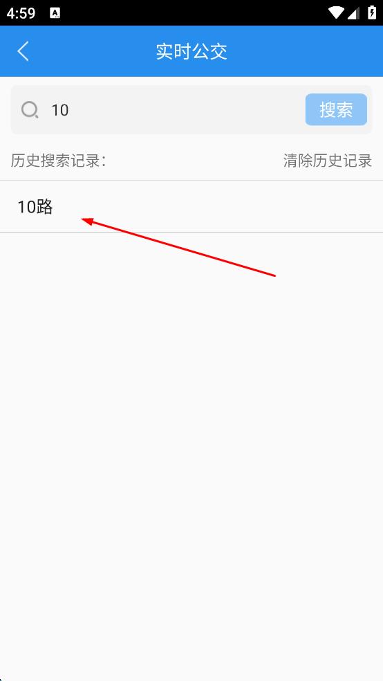 2、在實時公交查詢頁面,找到搜索框,輸入要查詢的公交線路,如“10路”,然后點擊“搜索”按鈕,或者在歷史搜索記錄中直接點擊“10路”。