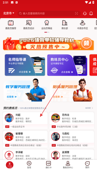 1、打開體教聯(lián)盟APP進入首頁在預約教練員板塊瀏覽眾多教練員信息,包括劉超、范偉龍等,根據(jù)教學項目、教學地區(qū)等信息,選擇合適的教練員,點擊進行預約。